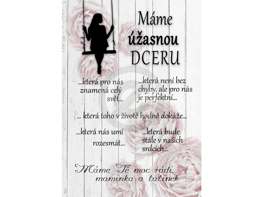 Obrázek s citátem na dřevěné bukové destičce můžete věnovat svým blízkým jako osobní dárek, který si mohou pověsit nebo jen opřít na poličce.TEXT : Máme úžasnou dceru....která pro nás znamená celý svět....která není bez chyby, ale pro nás je perfektní...která toho v životě hodně dokáže...která nás umí rozesmát....která bude stále v našich srdcích. Máme Tě moc rádi, Tvoje maminka a tatínek. Jedná se o originální návrh grafiky. Ručně lepeno a patinováno.